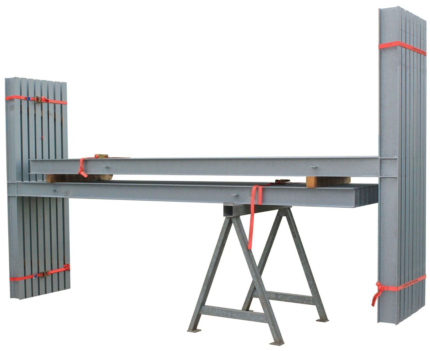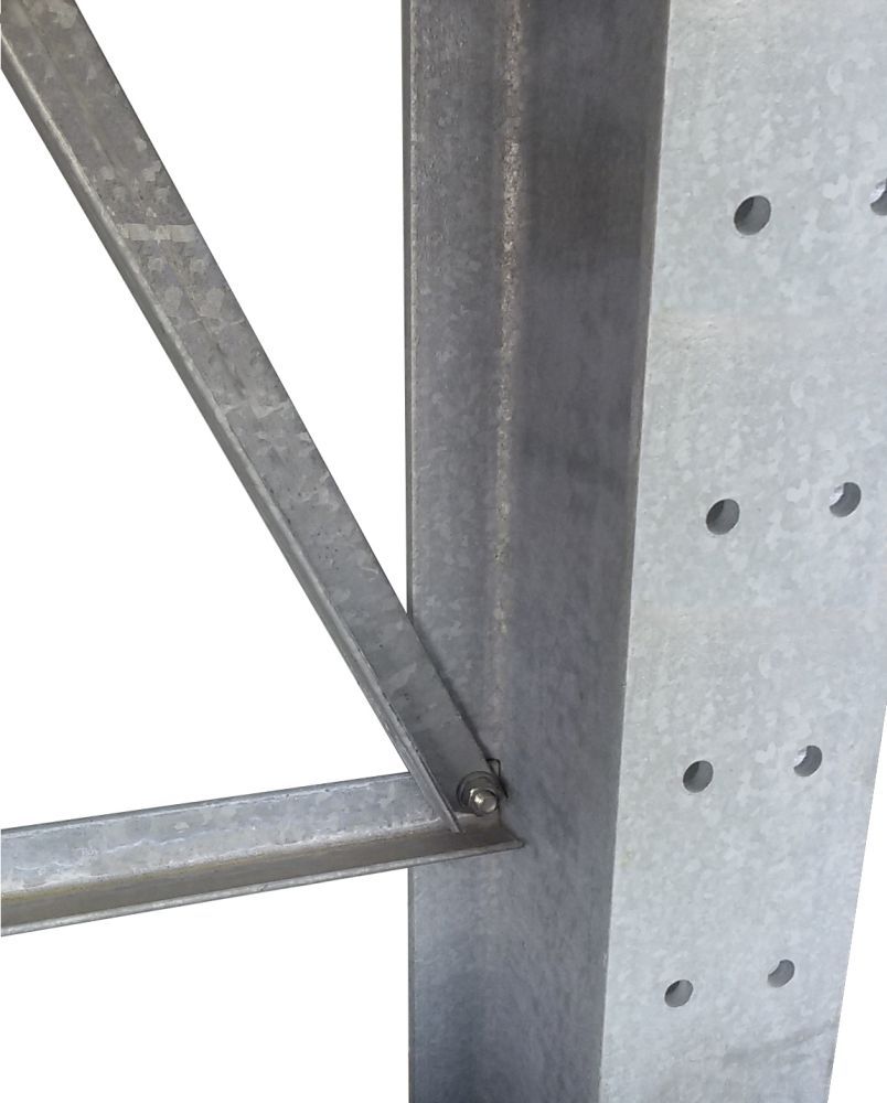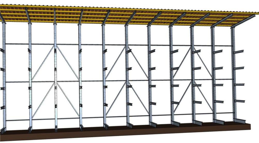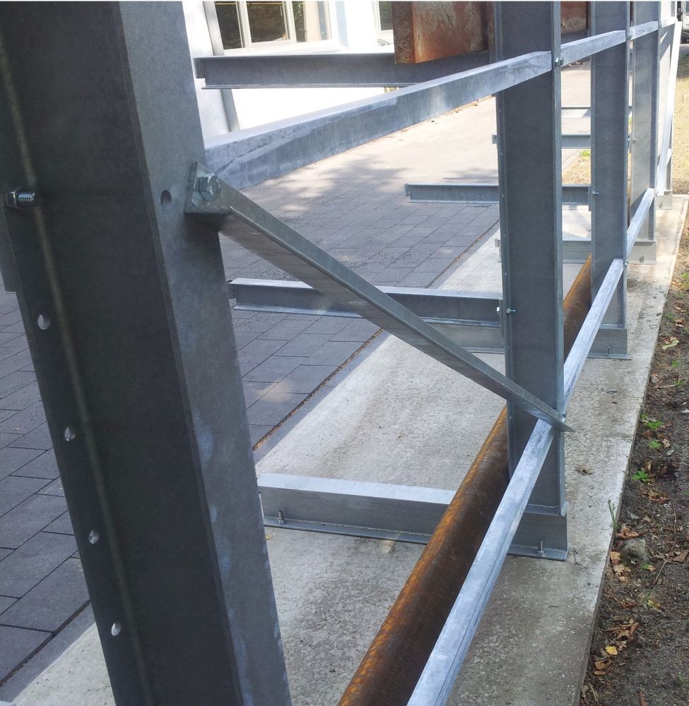 Alle Kragarmregale von {{comapny.name}} können so produziert werden, dass sie unter Berücksichtigung der örtlichen Wind- und Schneelasten mittels Dachträgern für die Aufnahme einer Dachkonstruktion vorbereitet sind.