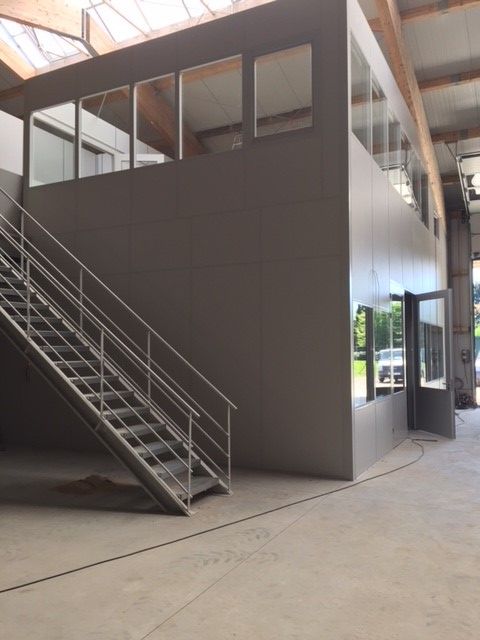 Unsere Meisterbüros / Hallenbüros bestehen aus 82 mm Wandstärke, 56 mm Stahlrahmenständerwerk und 2 x 13 mm melaminharzbeschichteten Spanplatten. Möglich ist eine selbsttragende bzw. abgehängte Mineralfaserdecke inkl. Staubdecke (bei freitragenden Büros).